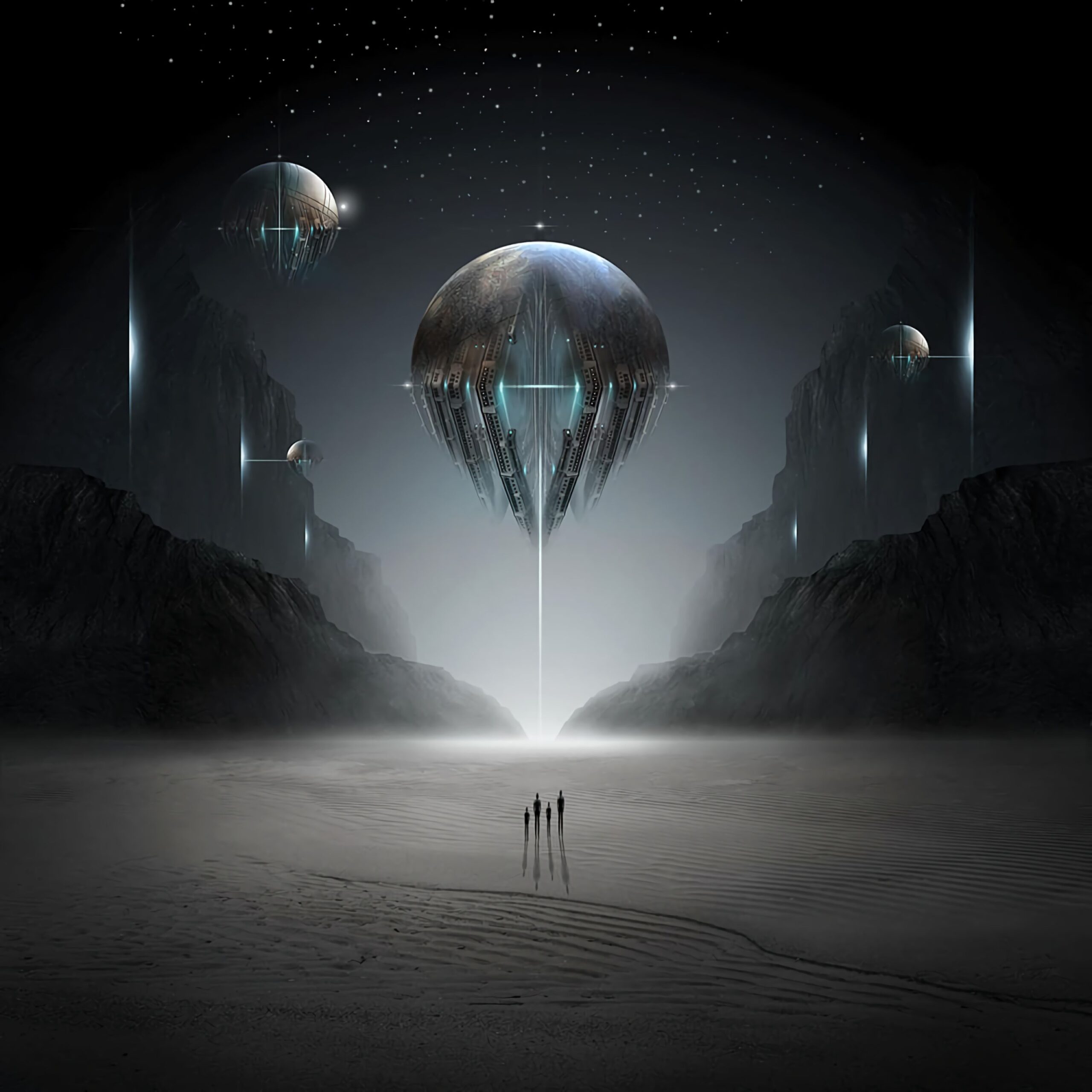 Featuring captivating silhouettes of planets and mysterious UFOs, this artwork brings the fantastic universe right to your screen. Perfect for Sci-Fi enthusiasts and art lovers alike.