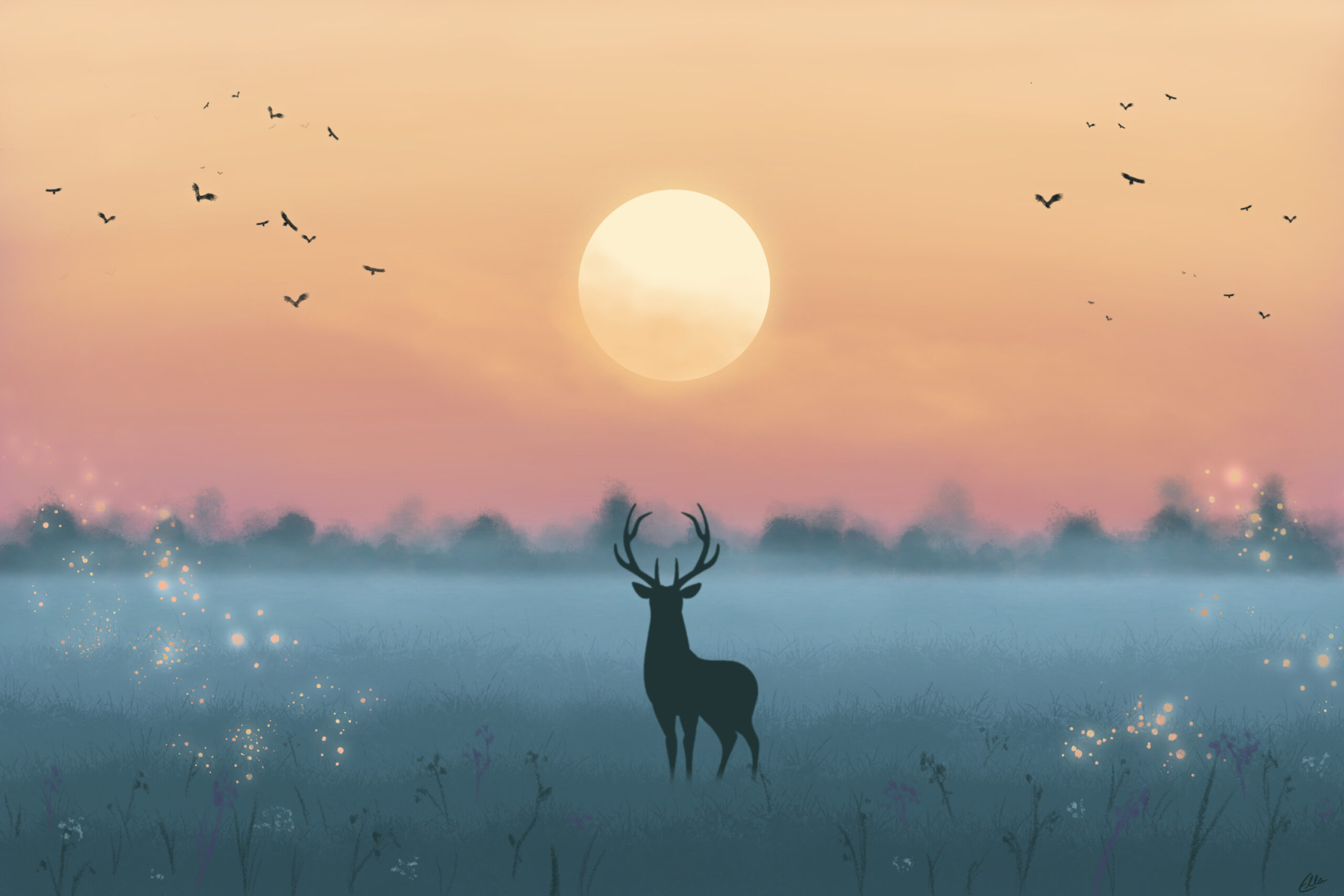 With a balance of deep contrasts and serene ambiance, this wallpaper creates a perfect blend of natural wonder and artistic elegance. The intricacy of the deer’s silhouette, combined with the mystical allure of the night sky, serves as a captivating focal point for any desktop setting.