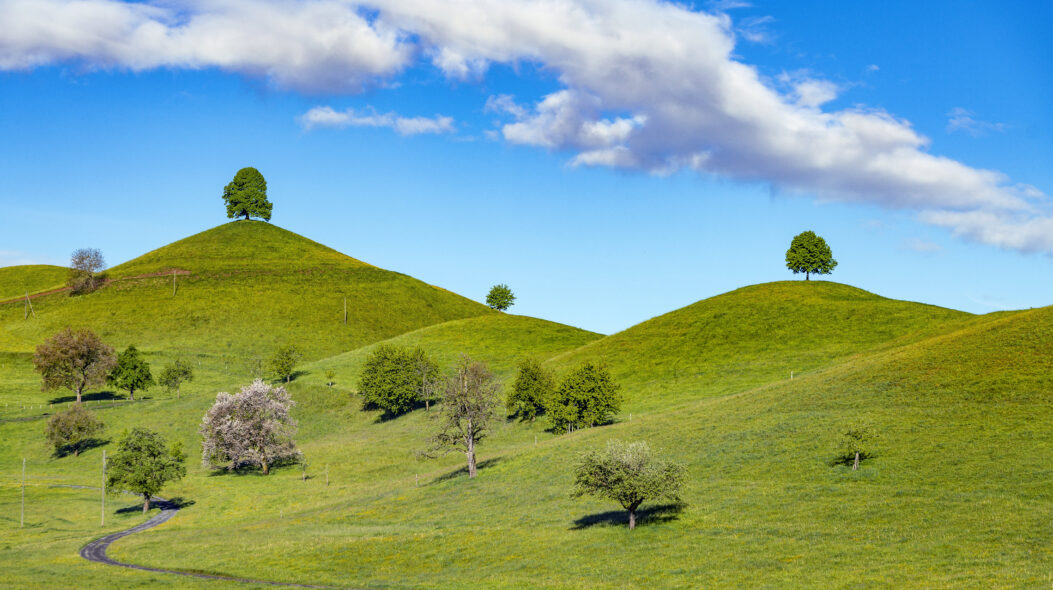 Escape to a serene landscape with this stunning desktop wallpaper featuring a breathtaking view of nature. A winding path leads up a lush green hill, surrounded by tall trees that stretch towards the sky. The vibrant grass and fluffy white clouds create a sense of tranquility, perfect for a calming atmosphere. Download now for Free and bring the beauty of nature to your screen.