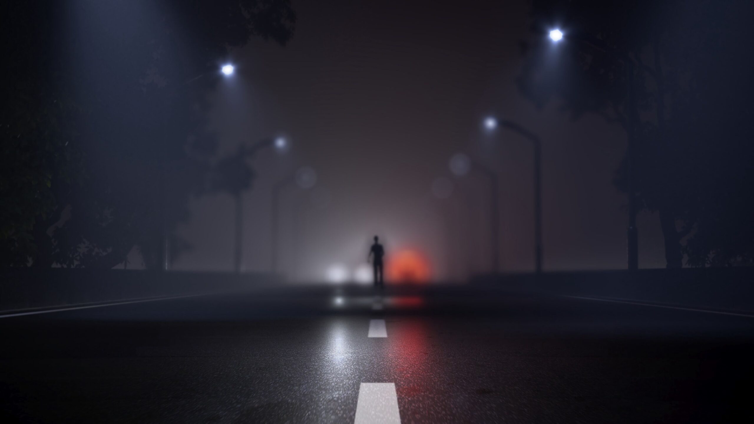 Enigmatic Foggy Road Silhouette – Dark & Smooth Desktop Wallpaper for a Dreamy Aesthetic Vibe