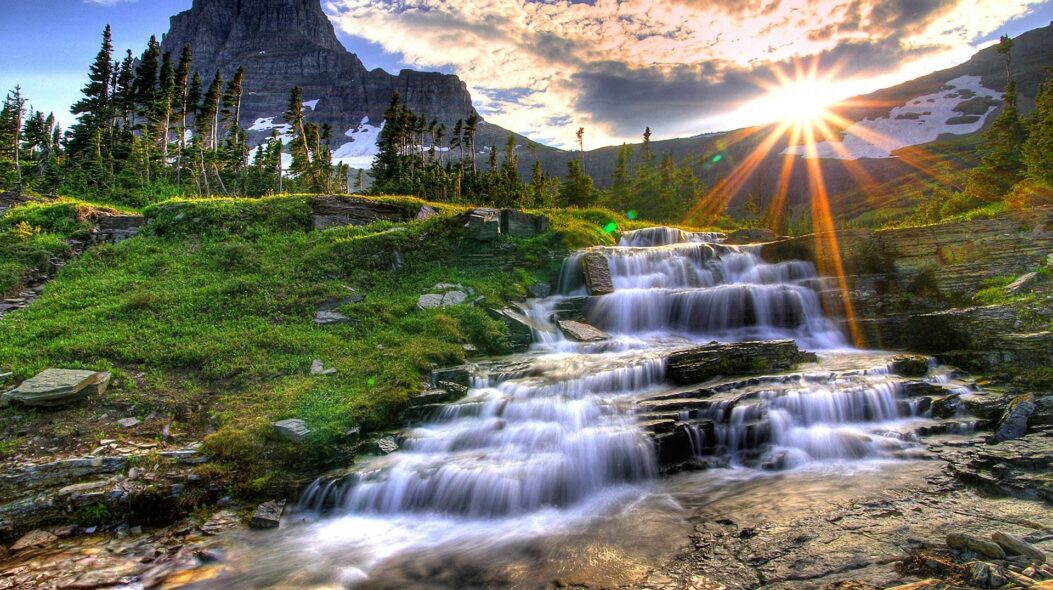 Immerse yourself in the serene beauty of nature with this stunning Desktop Wallpaper. Experience the majestic allure of a picturesque waterfall cascading down rugged stone cliffs, nestled amidst lush mountain greenery. As the sun ascends the horizon, it casts a warm, golden glow over the vibrant landscape, accentuating the crystal-clear stream below. The seamless blend of elements—sun, earth, and water—creates a breathtaking visual harmony that’s perfect for transforming your desktop into a window to nature’s wonders.