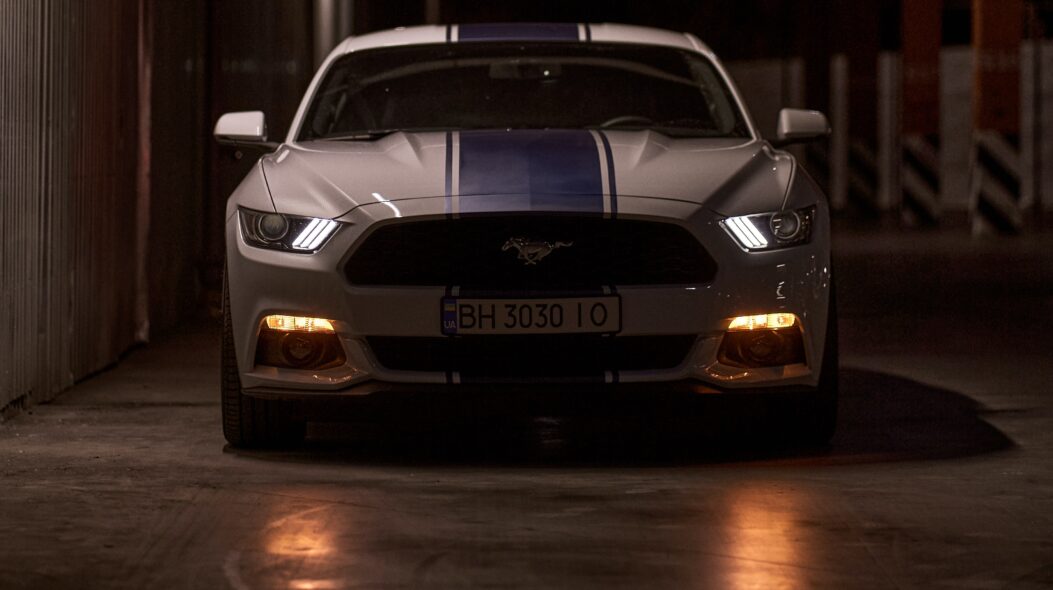 Mustang GT Sports Car 4K Wallpaper – Ultimate Front View with Bright Headlights for Phone Wallpaper