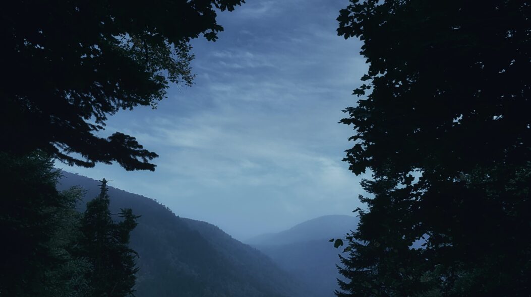 Immerse yourself in a breathtaking landscape where the moon hangs high above fog-kissed mountains, silhouetted trees stand tall, and the magic of dusk unfolds.