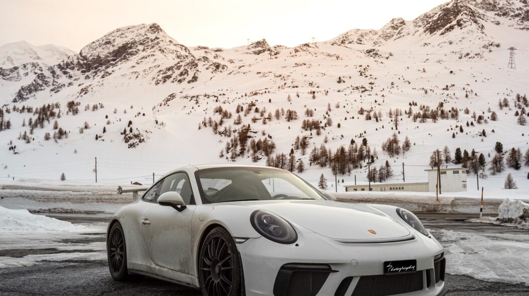White Porsche Sports Car 4K Wallpaper – Captivating Elegance in Snowy Mountains for Phone Wallpaper